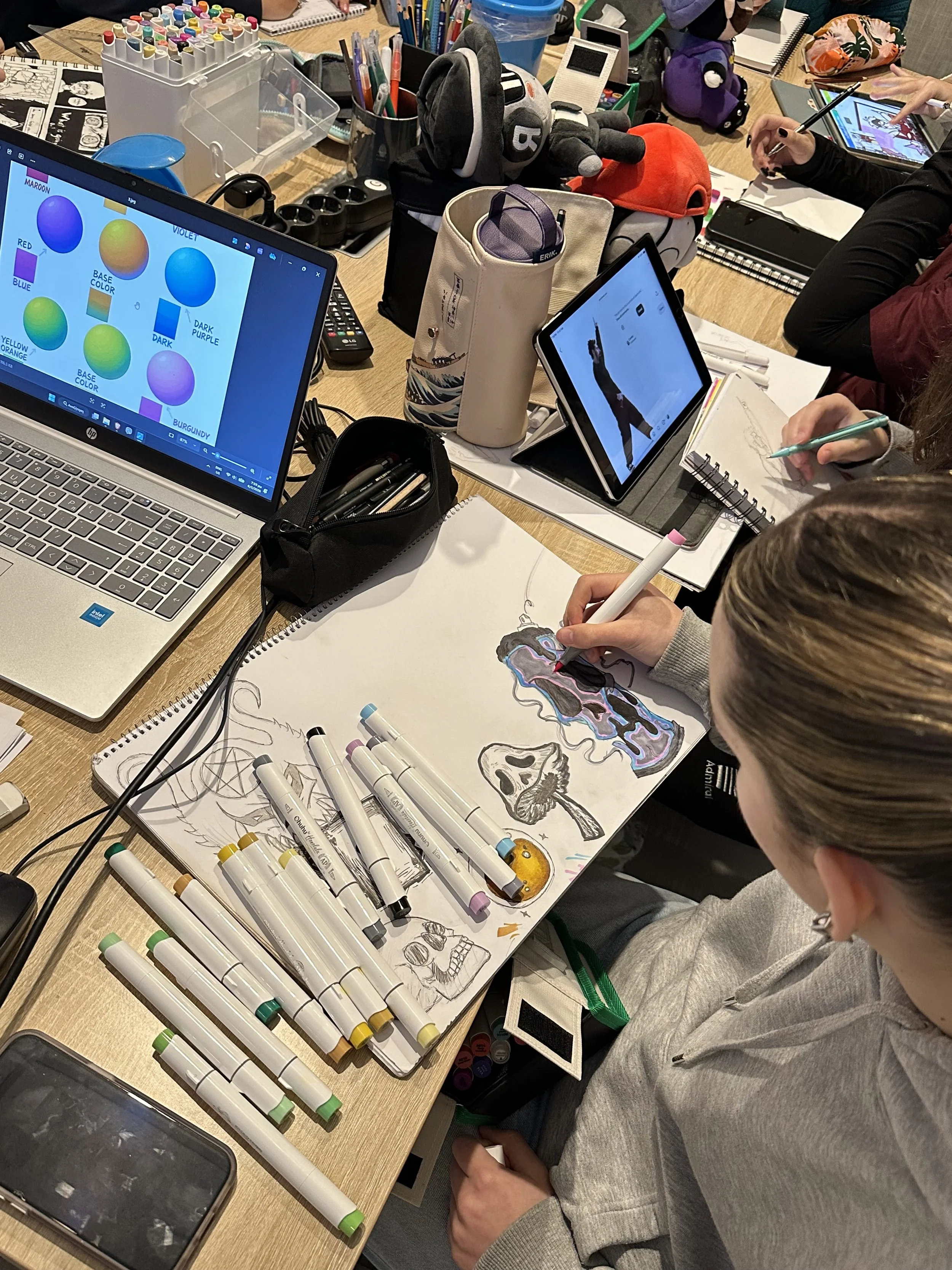 Η ύλη είναι προσαρμοσμένη αναλόγως και περιλαμβάνει βασικές ασκήσεις σκίτσου, σχεδιασμό χαρακτήρων, τεχνικές κόμικς, καρτούν, manga και anime. Η διάρκεια του τμήματος είναι μια σχολική χρονιά καθώς ξεκινάει από Σεπτέμβριο και ολοκληρώνετε Ιούνιο. Το μάθημα γίνεται μια φορά την εβδομάδα για 1,5 ώρα και για τα τμήματα 6-8 χρονών για 1 ώρα.